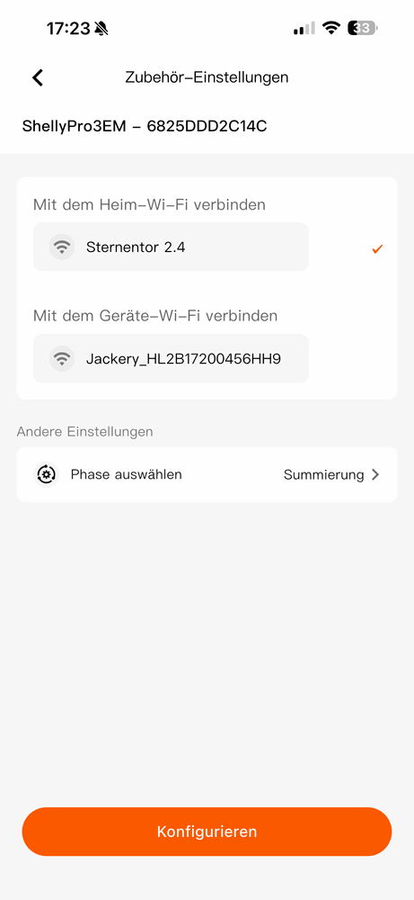 Meist möchte man sein Smartmeter auch noch in anderen Systemen und Apps einbinden und dann ist es sinnvoller, wenn du den Shelly Pro 3EM aus der Jackery Home App entfernst und zunächst über dein Heimnetz mit der Shelly App einrichtest (bzw. direkt über die IP) und danach dann erst in der Jackery Home App die bereits vorhandene WLAN Verbindung auswählst.
