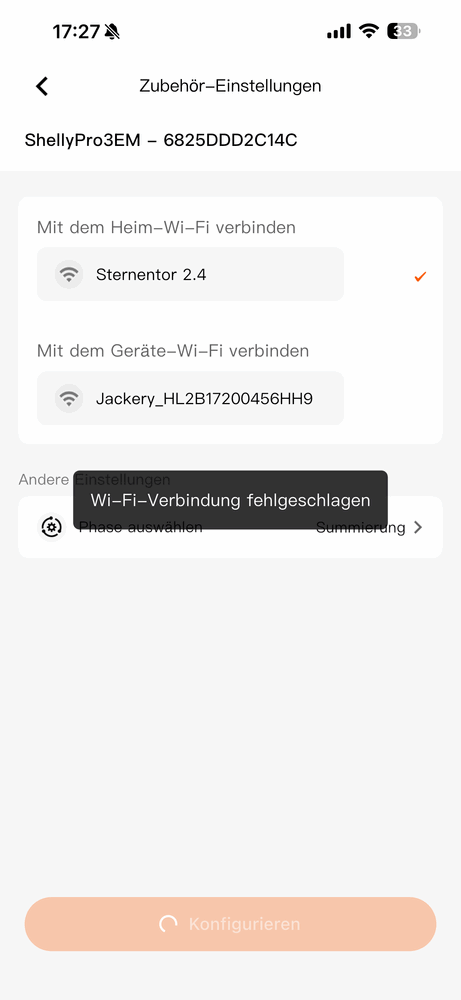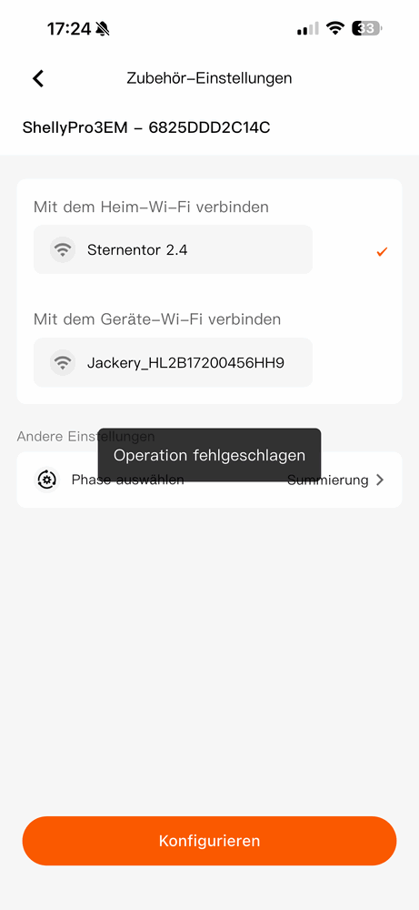 Was ich gar nicht verstehe, manchmal wird mir das Heimnetz gar nicht angezeigt (das Feld Heimnetz ist leer) oder ich sehe mein Heimnetz und im nächsten Schritt bekomme ich eine kurze Meldung, das die Verbindung zum Heimnetz fehlgeschlagen ist oder die Meldung "Operation fehlgeschlagen". Das Wifi Signal ist im Keller bei meiner Shelly optimal.