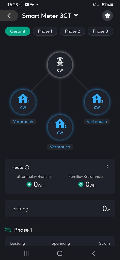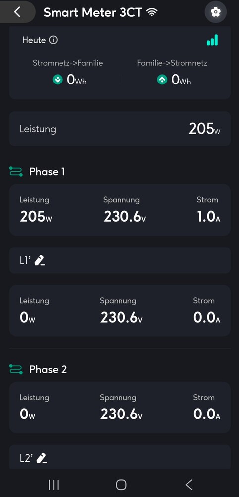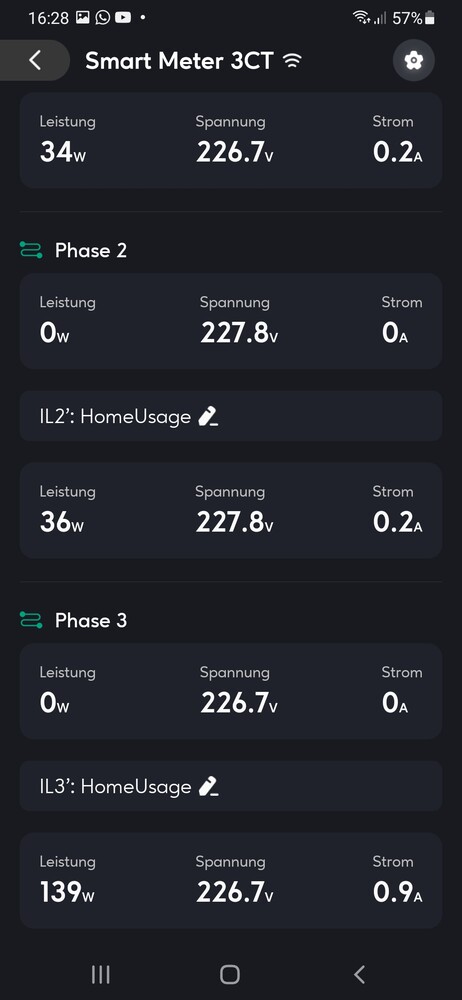 Wenn ich in der App Smart Meter 3CT öffne, sehe ich für alle 3 Phasen einen Verbrauch von 0 W. Jedoch zeigt die App bei z.B. L1': HomeUsage einen Verbrauch von 34 W an.