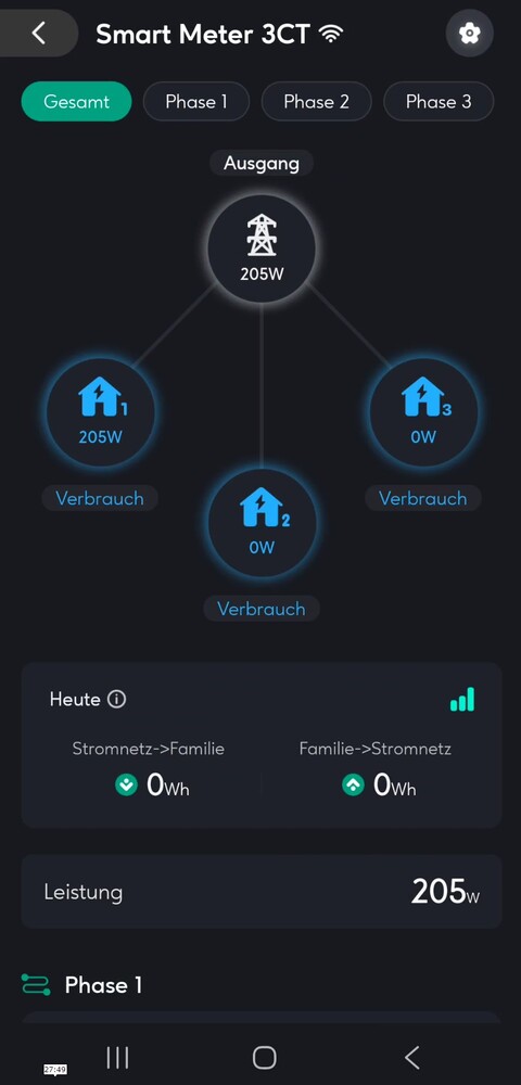 Am besten er wartet kurz die eine Minute, bis du in deiner App den Verbrauch -so wie hier bei Phase L1 dargestellt- sehen kannst.